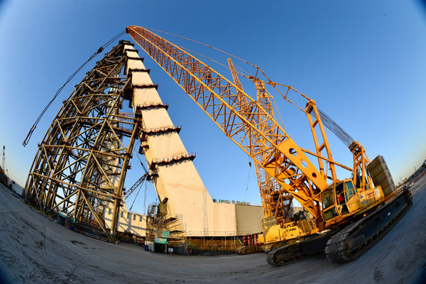 京西永定河畔,一台石油钻井平台专用巨型履带吊正与另一台配合吊车一起缓缓将一段几百吨重的钢柱提升到近百米高空……制造、运输、安装如此巨大的材料,北京城建集团的建设者又一次刷新了斜拉桥的施工记录。
