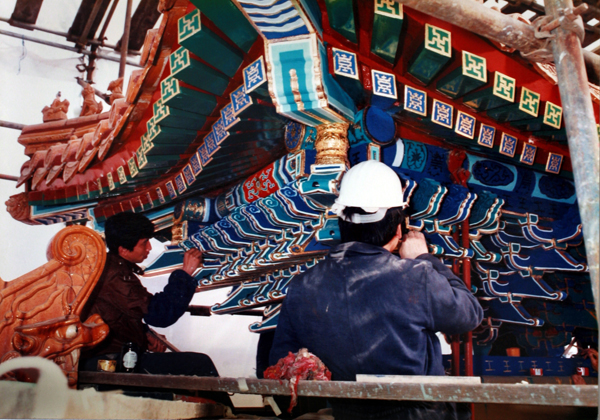 在琉璃厂和荣宝斋长大的秦书林无疑具有成为优秀彩画师的灵气和悟性,更有坚韧的品格。学习彩画一年多的时间,就可以与老师父们一道在颐和园雕梁画栋,秦书林是油漆彩画界第一位做到的。
