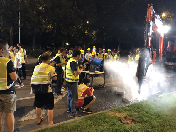 李建涛说说了提升文明施工水平,项目部在路面铣刨机安装了吸尘和雾化装置,有效降低扬尘;路面清扫车辆采用新型路面干洗车,配合雾炮机、喷淋和吸尘设备的使用,有效提高清扫效果和避免清扫过程中的二次扬尘。
