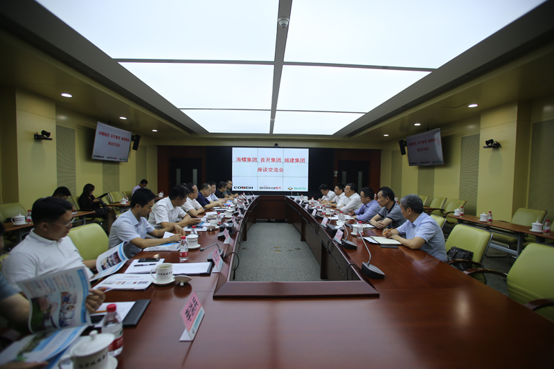 在参观集团展览中心、观看首开集团和集团宣传片后,大家展开友好座谈。高登榜介绍了海螺集团发展历程、企业规模,以及水泥制造产业、新型建材产业的市场布局、发展优势等。他说希望能够与首开集团、城建集团在北京市场加强合作,并联手走向海外。