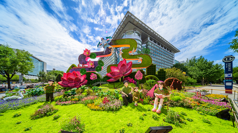 在年号台、观礼台的四周,成片的花卉景观引人注目:年号台底座下金灿灿的孔雀草、大片盛放的红色四季秋海棠、绿草和金叶萼距花拼出的长城纹……红色、黄色、绿色的花坛与现场布置完美呼应,烘托大会的庄严庄重。