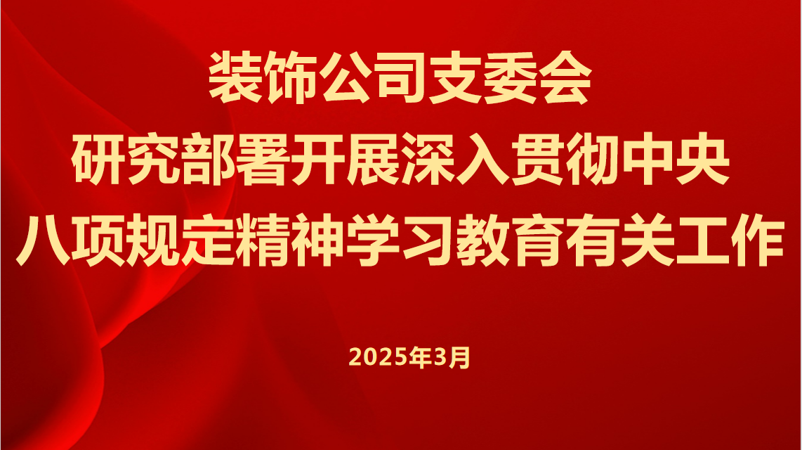 会议要求,要扎实加强组织领导,突出实干实绩成效 。要压紧压实责任,公司支委对学习教育负总责,抓好统筹协调。公司主要负责同志要担负起第一责任人责任,领导班子及支委其他成员履行好“一岗双责”,紧密结合中心工作,精心组织实施,加强分类指导,做好宣传引导,坚决反对形式主义。公司上下要以高度的政治自觉、思想自觉和行动自觉,扎实开展学习教育。党员干部要带头,全面落实各项任务。全体党员干部要迅速行动起来,结合工作实际,学深悟透中央八项规定精神,共同推动装饰公司作风建设取得新成效。