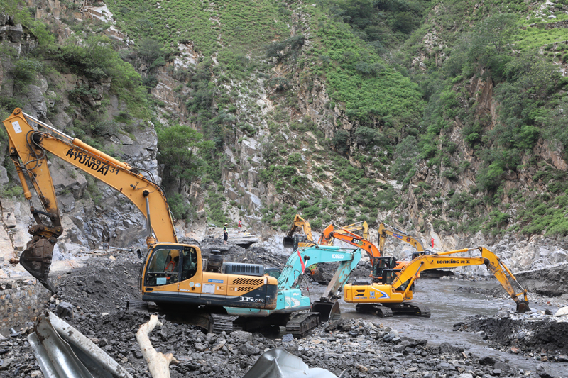 “车过不去就走,走不过去就爬,再困难的活都有办法,但联系不上肯定不行,要完成任务,必须要联系的上。”刘奎生斩钉截铁地说。付勇攀和杨金钟根据掌握的情况,迅速划定了施工区,并在各施工区现场设置了指挥点,通过“接力”的方式,将机械设备运到哪了、进展如何、现场需配合协调事项等信息进行快速传递。为方便沟通,指挥部多方联系购置了8部卫星电话,协调了一条军用电话专线,争分夺秒为打通生命线赢得宝贵时间。与此同时,集团抢险大队和城建华晟一起,按照指挥部确定的施工方案,通过埋管、搭钢便桥、填堵塌方等方式,随坡就势快速推进施工进展。
