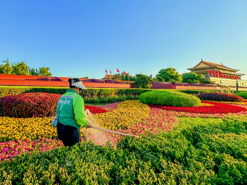国庆期间,天安门广场中心花坛和长安街沿线10座立体花坛再次成为热点,游人如织,共赏繁花长卷。为做好节日保障,园林集团成立节日值守专队,24小时对天安门广场中心花坛和长安街花坛进行值班值守,同时有序开展绿篱、草坪修剪、地栽花卉科学养护等工作,确保假期期间花卉景观呈现最佳状态。郑州花卉景观布置项目再现园林速度,突破极限时间和恶劣天气影响,实现京外花卉景观实施的“最短时间,最大体量”。合肥园博园项目养护完美演绎首善标准、园林品质,为全国游客展示出最美的风景线。