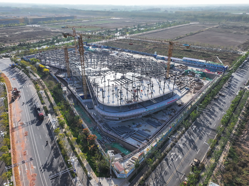 雄安体育中心项目1800名建设者正全力以赴向年底整体亮相目标冲刺。目前体育场初装修已完成75%,幕墙完成88%,体育馆幕墙完成80%,金属屋面完成92%,游泳馆幕墙完成85%,金属屋面完成94%。