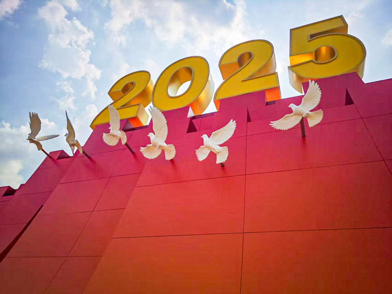 人民英雄纪念碑前,“钢铁长城”主题年号台巍然矗立,14座烽燧托举起“1945”“2025”字样,14只“和平鸽”振翅飞翔。